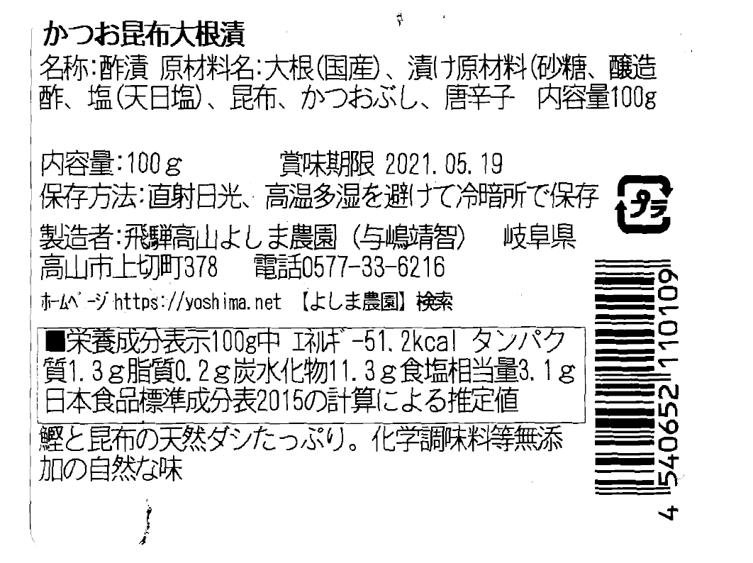 | 原材料名 | ・丸ごと赤かぶ漬150g(赤かぶ 天日塩 米糠) ・赤かぶご飯のとも100g(赤かぶ 大根 キュウリ しょうが、ゴマ 唐辛子 天日塩) ・キュウリ粕漬け2本(きゅうり 酒粕 砂糖 天日塩) ・たくあん漬100g(大根、米糠 天日塩) ・かつお昆布大根漬100g(大根 鰹節 昆布 砂糖 醸造米酢 天日塩) ・菊芋味噌漬100g(菊芋 味噌(大豆 米 小麦) ・酒粕(米 アルコール)砂糖 天日塩) ・品漬け120g(赤かぶ 大根 キュウリ 菊芋 天日塩) ※季節によって商品内容が変更(同一価格内)されることがあります。 |