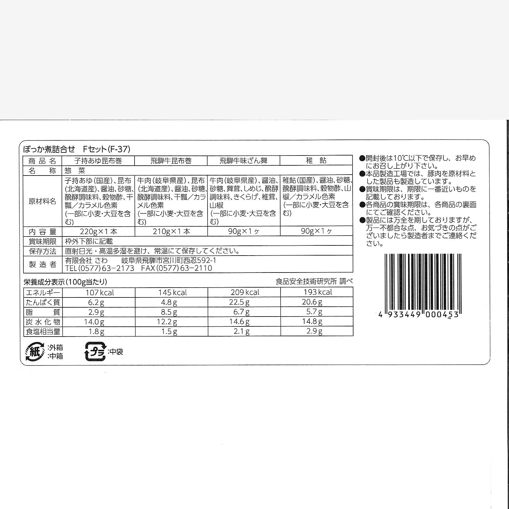 | 原材料名 | 【飛騨牛昆布巻】牛肉(岐阜県産)、昆布(北海道産)、醤油、砂糖、醗酵調味料、干瓢/カラメル色素、(一部に小麦・大豆・牛肉を含む) 【飛騨牛味ざん舞 】牛肉(岐阜県産)、醤油、砂糖、舞茸、しめじ、醗酵調味料、きくらげ、椎茸、山椒、(一部に小麦・大豆・牛肉を含む) 【子持あゆ昆布巻】子持あゆ(国産)、昆布(北海道産)、醤油、砂糖、醗酵調味料、穀物酢、干瓢/カラメル色素、(一部に小麦・大豆・牛肉を含む) 【稚 鮎】稚鮎(国産)、醤油、砂糖、醗酵調味料、穀物酢、山椒/カラメル色素、(一部に小麦・大豆・牛肉を含む) |