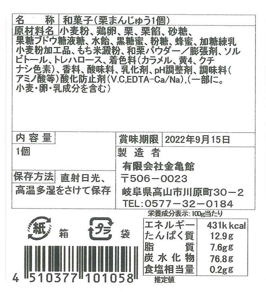 | 原材料名 | 小麦粉、 鶏卵、 栗 、 栗餡、 砂糖、 果糖ブドウ糖液糖、水飴、 黒糖蜜、粉糖、蜂蜜、加糖練乳 小麦粉加工品、 もち米澱粉、 和栗パウダー/膨張剤、ソル ビトール、トレハロース、 着色料(カラメル、 黄4、 クチ ナシ色素)、 香料、酸味料、乳化剤、pH調整剤、調味料( アミノ酸等) 酸化防止剤(V.C,EDTA-Ca/Na)、(一部に小麦・卵・乳成分を含む) |