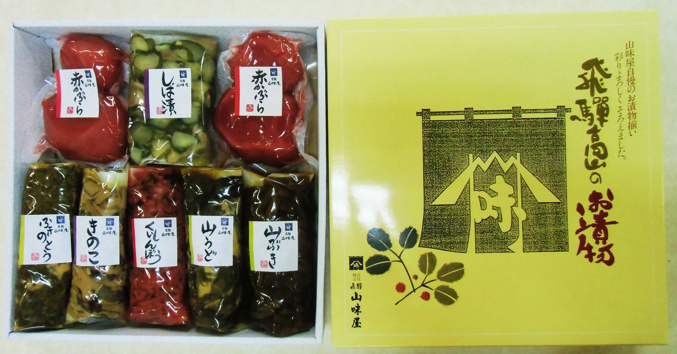 | 内容量 | 赤かぶら漬(170g×2)、くいしんぼう(150g)、ふきのとう味噌漬(60g)山うど味噌漬(60g)、山ぶき(120g)、きのこ(120g)、しば漬(100g) |