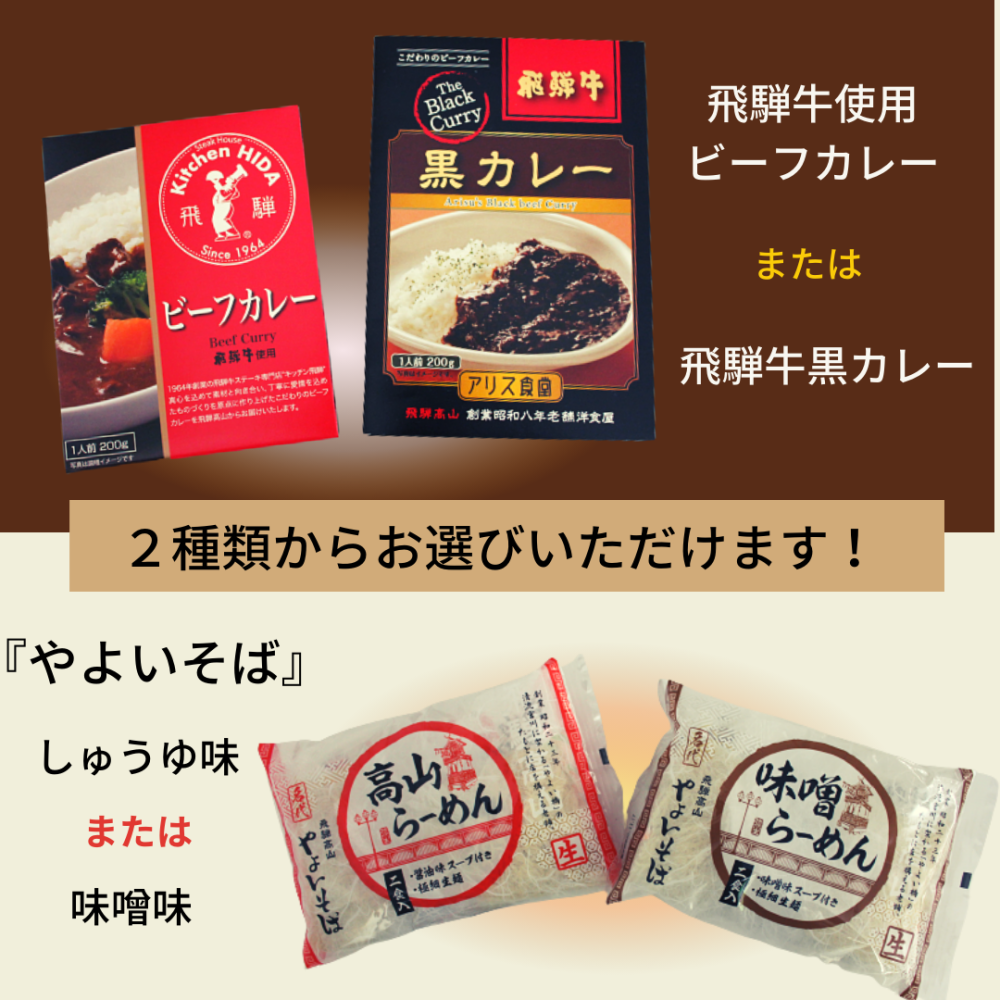 飛騨高山の味をたっぷり堪能できる贅沢なセット。味噌、醤油、高山ラーメン、漬物など…飛騨の魅力がぎゅっと詰まった商品となります。ギフトに喜ばれること間違いなし!【飛騨牛カレーと高山ラーメンは、それぞれ商品をお選びいただけます。】