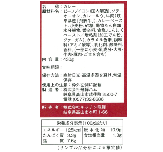 | 原材料名 | ソテーオニオン (たまねぎ (国産)、大豆油)、牛肉(岐阜県産「飛騨牛」)、 カレールウ、カレーペースト 〔ソテーオニオン、糖類(砂糖、水あめ)、 トマトピューレー、カレー粉、にんにくペースト、しょうがペースト〕、ビーフブイヨン (牛骨)、 小麦粉、砂糖、たん白加水分解物、香辛料、食塩、にんにくペースト/増粘剤(加工デンプン、グァーガム)、カラメル色素、調味料(アミノ酸等)、 乳化剤、酸味料、香料、(一部に小麦・乳成分・大豆・牛肉・豚肉・ ごまを含む) |