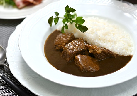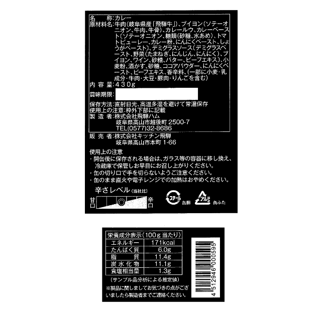 | 原材料名 | 牛肉(岐阜県産「飛騨牛」)、ブイヨン(ソテーオニオン、牛肉、牛骨)、カレールウ、カレーペースト〔ソテーオニオン、糖類(砂糖、水あめ)、トマトピューレ―、カレー粉、にんにくペースト、しょうがペースト〕、デミグラスソース〔デミグラスペースト、野菜(たまねぎ、にんじん、にんにく)、ブイヨン、ワイン、砂糖、バター、ビーフエキス〕、小麦粉、酒かす、砂糖、ココアパウダー、にんにくペースト、ビーフエキス、香辛料、(一部に小麦・乳成分・牛肉・大豆・豚肉・りんごを含む) |