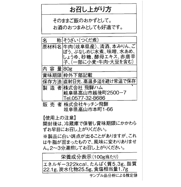 原材料名 牛肉(岐阜県産)、清酒、本みりん、ごぼう、ぶなしめじ水煮、味噌、水あめ、しょうゆ、砂糖、酵母エキス、赤唐辛子、(一部に小麦・牛肉・大豆を含む)
