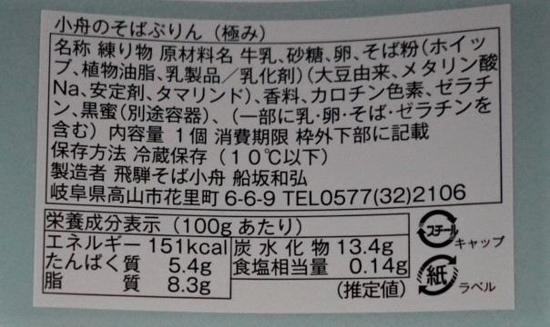 | 原材料名 | 牛乳、砂糖、卵、そば粉、(ホイップ、植物油脂、乳製品、乳化剤)(大豆由来、メタリン酸N a、安定剤、タマリンド)香料、カロチン色素、ゼラチン、黒蜜 |