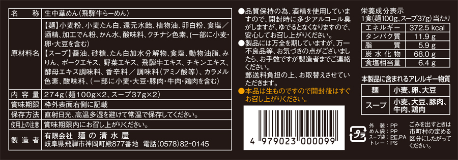 | 原材料名 | 【麺】小麦粉(国内製造)、小麦たん白、還元水飴、植物油、卵白粉、食塩/酒精、加工でん粉、かん水、酸味料、クチナシ色素(一部に小麦・卵・大豆を含む)【スープ】鶏脂、魚介エキス、食塩、畜肉エキス、しょうゆ、たん白加水分解物、砂糖、かつおぶし、さばぶし粉末、昆布エキス、香辛料、いわし煮干し/調味料(アミノ酸等)、加工でん粉、カラメル色素、(一部に小麦・大豆・鶏肉・豚肉・さばを含む) |