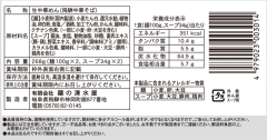 | 原材料名 | 【麺】小麦粉(国内製造)、小麦たん白、還元水飴、植物油、卵白粉、食塩/酒精、加工でん粉、かん水、酸味料、クチナシ色素、(一部に小麦・卵・大豆を含む) 【スープ】醤油、食塩、動物油脂、砂糖、畜肉エキス(豚・鶏)、野菜エキス、香辛料/調味料(アミノ酸等)、カラメル色素、酸味料、(一部に小麦・大豆・豚肉・鶏肉を含む) |