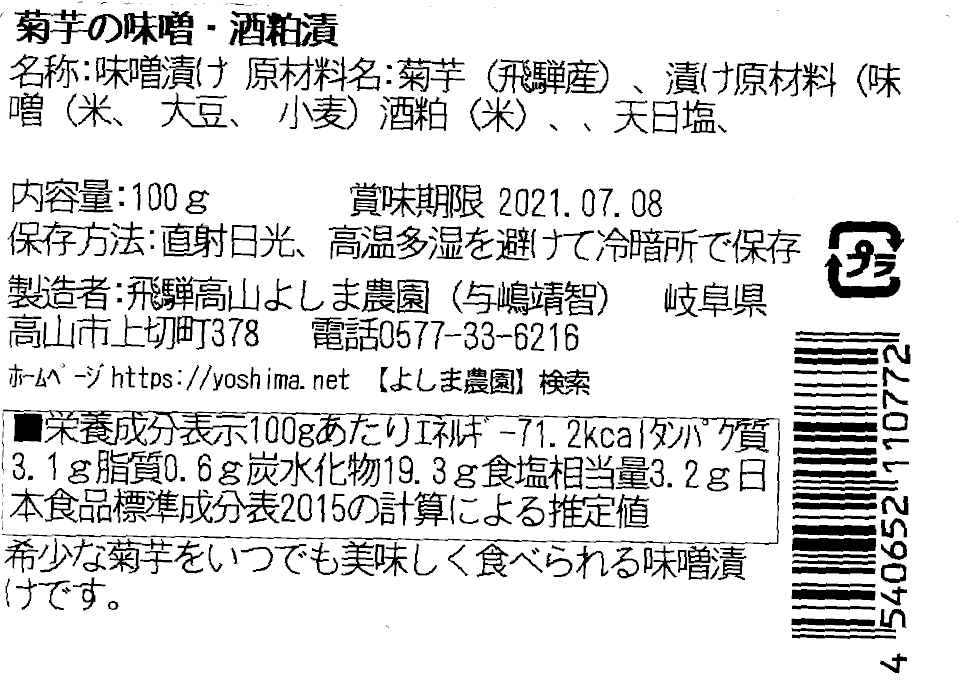 | 原材料名 | 菊芋 味噌(大豆 小麦 米 食塩) 酒粕(米 アルコ―ル) 種子島産粗糖 天日塩 |