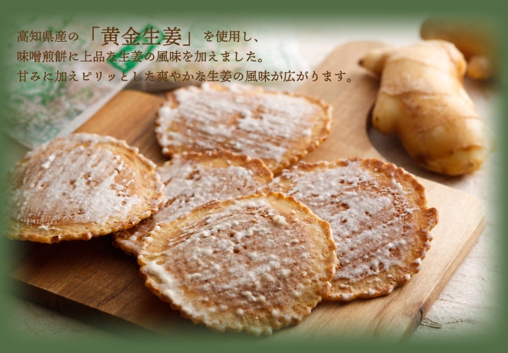 土蔵熟成自家製味噌を使用し、国産原材料にこだわった手作り味噌煎餅に生の生姜を使用しピリッとさわやかな味わいです。