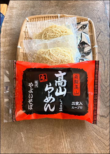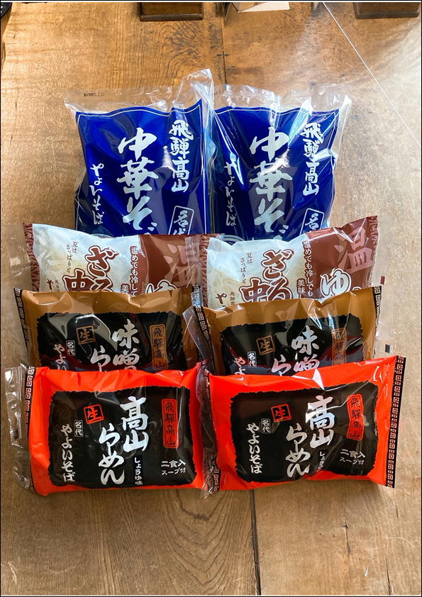 | 内容量 | 中華そば980g×2、高山ラーメンしょうゆ味270g×2、高山ラーメンみそ味284g×2、ざる中華・ゆづき中華400g×2 |