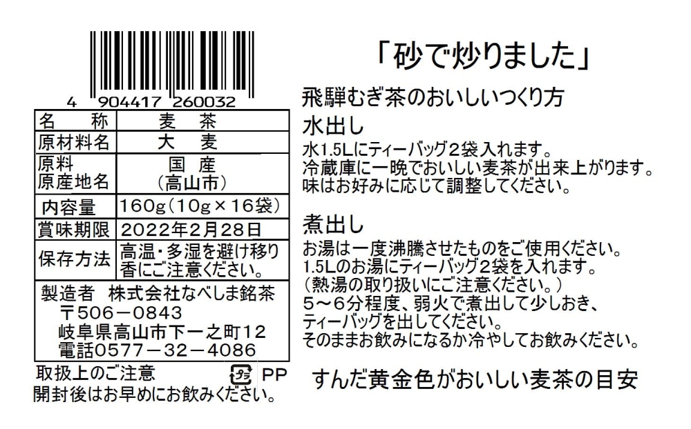 雪の中で越冬することで甘みを増した飛騨産のAAランクの六条大麦を使用。砂炒りによる香ばしさも格別な国内外で人気の麦茶です。