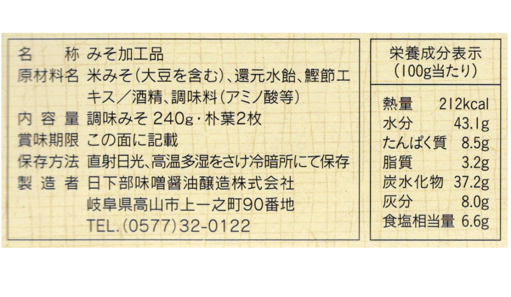 | 原材料名 | 米みそ(大豆を含む、国内製造)、還元糖水飴、鰹節エキス / 酒精、調味料(アミノ酸等) |