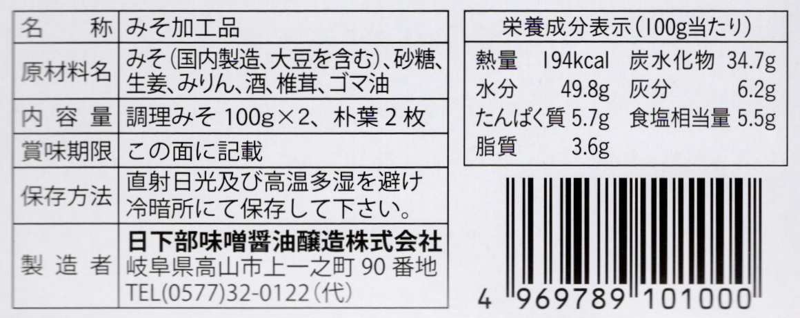| 原材料名 | みそ(国内、大豆含む)、砂糖、生姜、みりん、酒、椎茸、ゴマ油 |