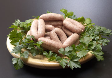【ウインナー・ソーセージ】天然の羊腸の中に、10数種類のスパイスと合挽き肉で造った手造りのソーセージです。スパイスの風味と肉々しいのソーセージの食感をお楽しみ下さい。