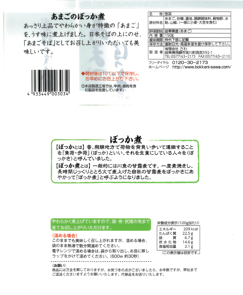 | 原材料名 | あまご(岐阜県産)、砂糖、醤油、醗酵調味料、穀物酢、水飴、山椒 |