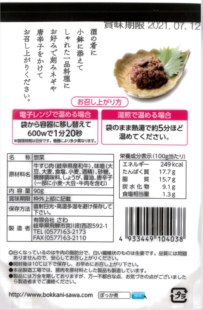 | 原材料名 | 牛すじ肉(岐阜県産和牛)、味噌(大豆、大麦、食塩、小麦、酒精)、砂糖、醗酵調味料、しょうが、醤油、唐辛子 |