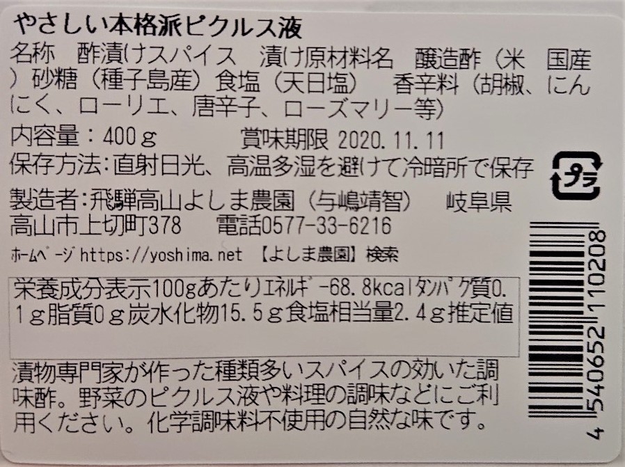 | 原材料名 | 醸造酢(米 国産)砂糖(種子島産)食塩(天日塩) 香辛料(胡椒、にんにく、ローリエ、唐辛子、ローズマリー等) |