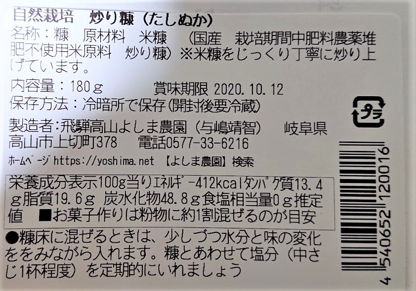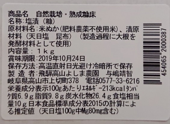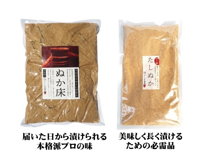 | 原材料名 | 名称:糠床(ぬか漬けの素) 原材料名:米ぬか(国内製造)、食塩、昆布 |