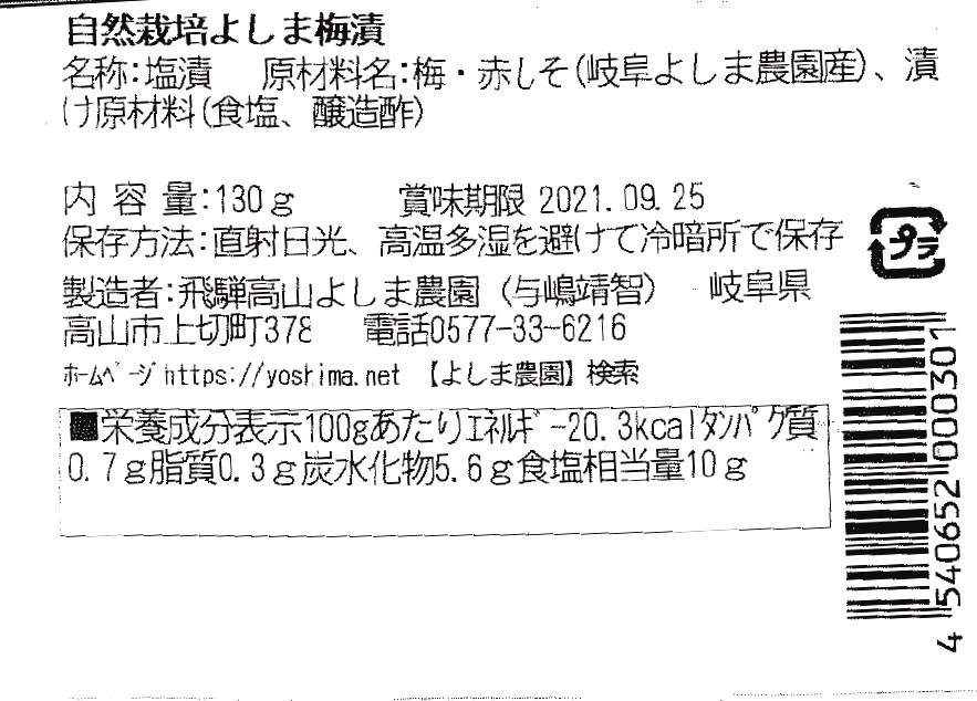 | 原材料名 | 名称:塩漬 原材料名:梅・赤しそ(岐阜よしま農園産)、漬け原材料(食塩、醸造酢) |