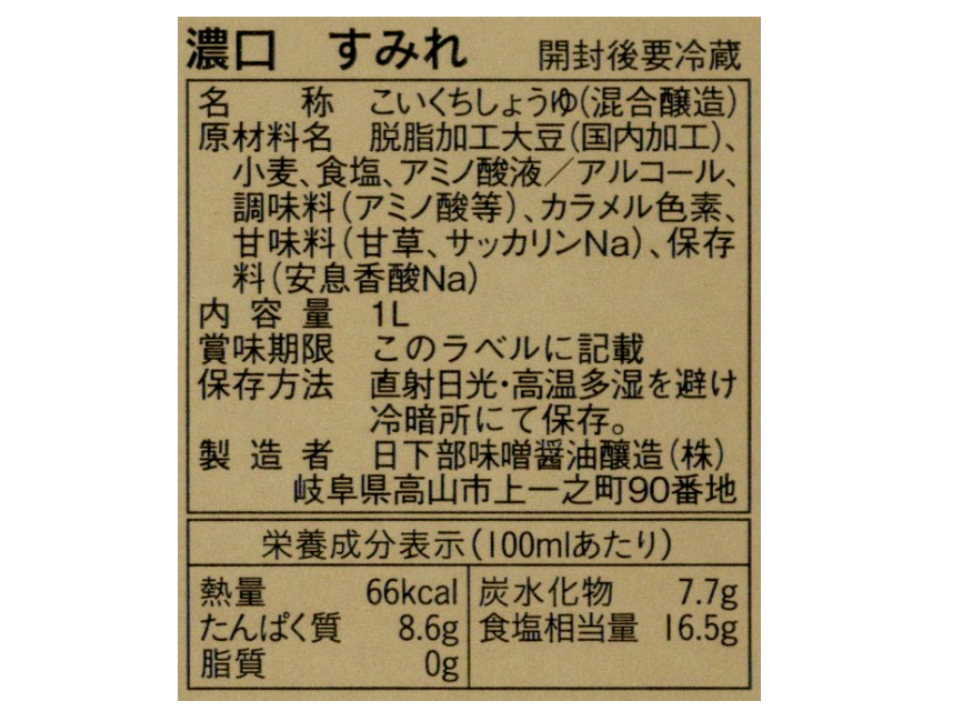 | 原材料名 | 脱脂加工大豆(国内加工)、小麦、食塩、アミノ酸液 / アルコール、調味料(アミノ酸等)、カラメル色素、甘味料(甘草、サッカリンNa)、保存料(安息香酸Na) |