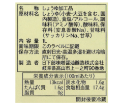 | 原材料名 | しょうゆ(本醸造)(小麦、大豆を含む)、食塩 / アルコール、調味料(アミノ酸等)、酸味料、保存料(安息香酸Na)、甘味料(サッカリンNa、甘草) |