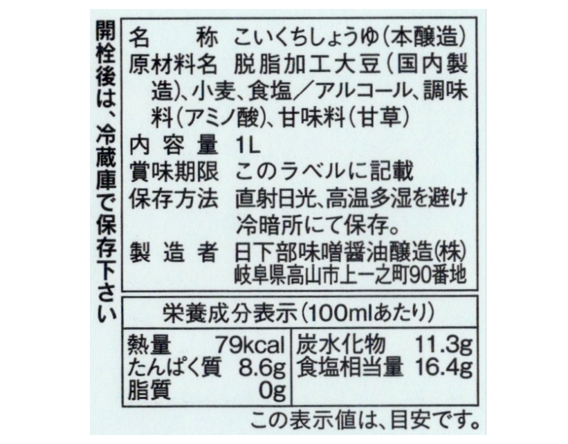 | 原材料名 | 脱脂加工大豆(国内加工)、小麦、食塩 / アルコール、調味料(アミノ酸)、甘味料(甘草) |