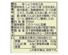 | 原材料名 | しょうゆ(小麦・大豆を含む、国内製造)、発酵調味料、かつお節エキス、さば節、むろあじ節、かつお節、砂糖、たんぱく加水分解物 / アルコール、調味料(アミノ酸等)、V.B1 |