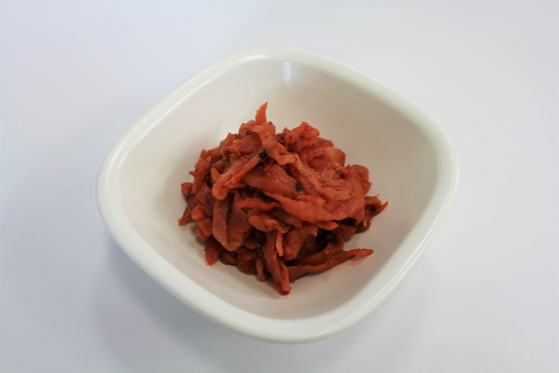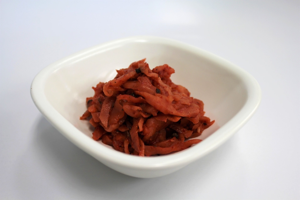 | 原材料名 | 赤かぶら、大根、生姜、しそ、漬け原材料[食塩、還元水あめ、りんご加工品(りんご、ぶどう糖液糖)、醸造酢、唐辛子、果糖、おろしにんにく(にんにく、食塩)、魚醤、ビーフ風味調味料、サケエキス、/調味料(アミノ酸等)、増粘多糖類、パプリカ色素、(一部に小麦・乳製品・さけ・大豆・鶏肉・豚肉・りんご・魚介類を含む) |