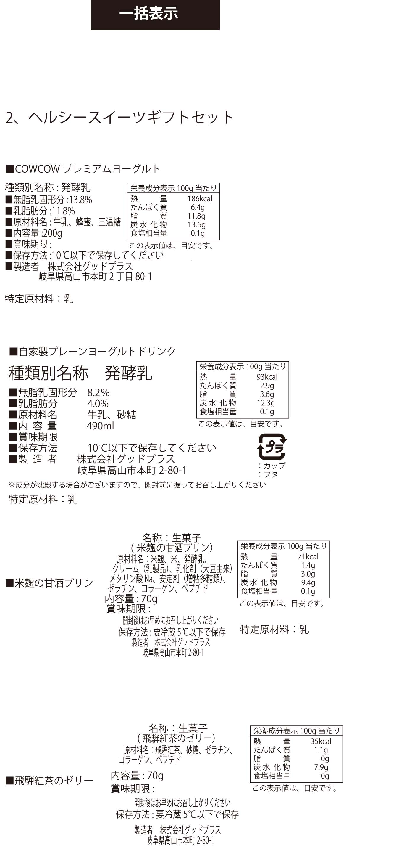 | 原材料名 | ①牛乳、ハチミツ、三温糖 ②牛乳、砂糖 ③米麹、米、発酵乳、クリーム(乳製品)、乳化剤(大豆由来)、メタリン酸Na、安定剤(増粘多糖類)、ゼラチン、コラーゲン、ペプチド ④飛騨紅茶、砂糖、ゼラチン、コラーゲン、ペプチド |