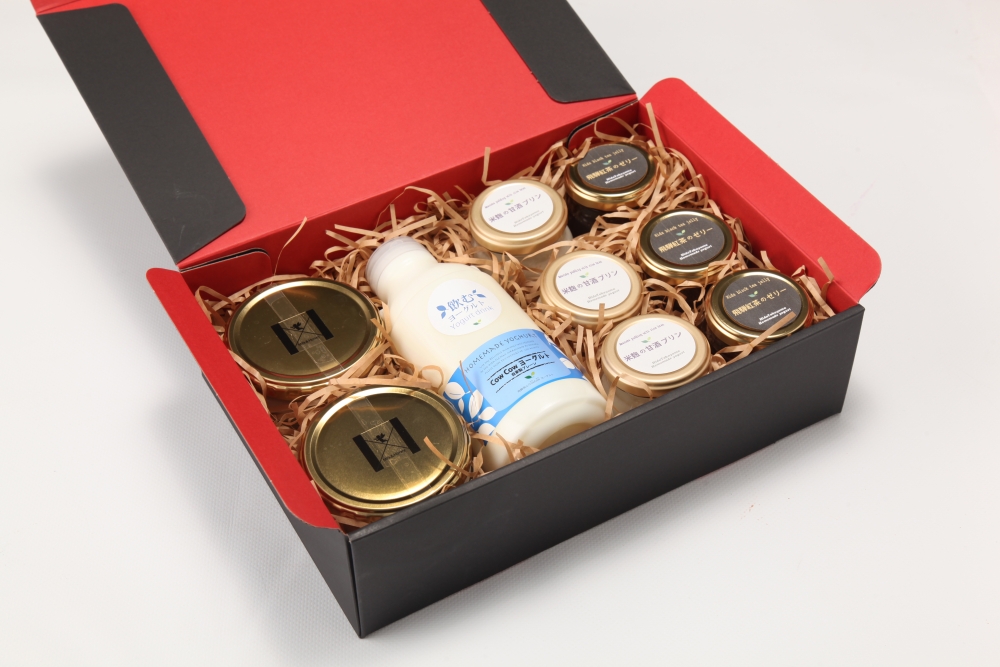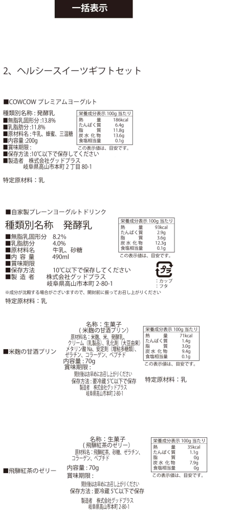 | 商品名 | 【ヘルシースイーツギフトセット】①CowCowプレミアムヨーグルト②自家製プレーンヨーグルトドリンク③米こうじの甘酒プリン④飛騨紅茶のゼリー ≪産地直送便≫ |