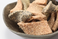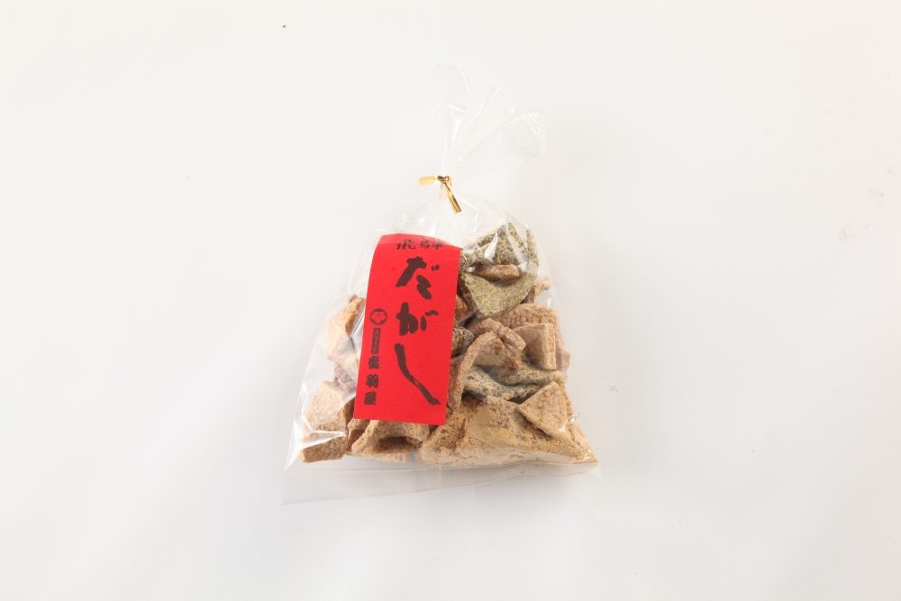 飛騨地方の三大駄菓子に数えられる、米はぜやごまを飴で板状に固めきな粉をまぶしたお菓子です。きな粉、抹茶、ニッキ、山椒の味など色んな味がお楽しみいただけるのも特徴です。