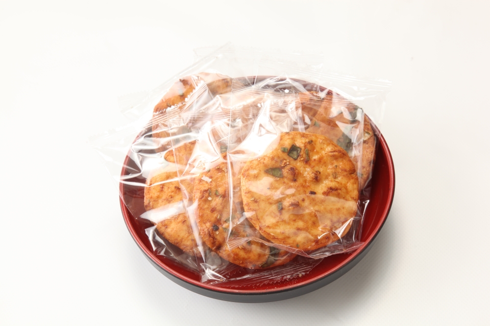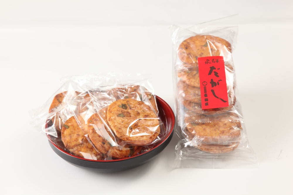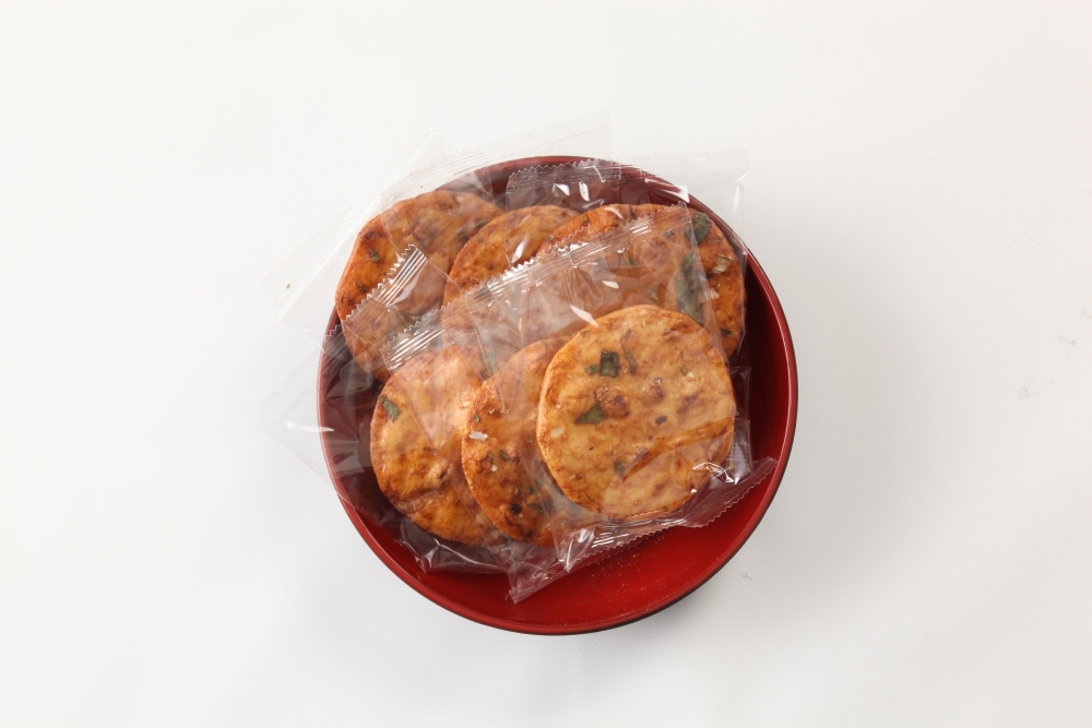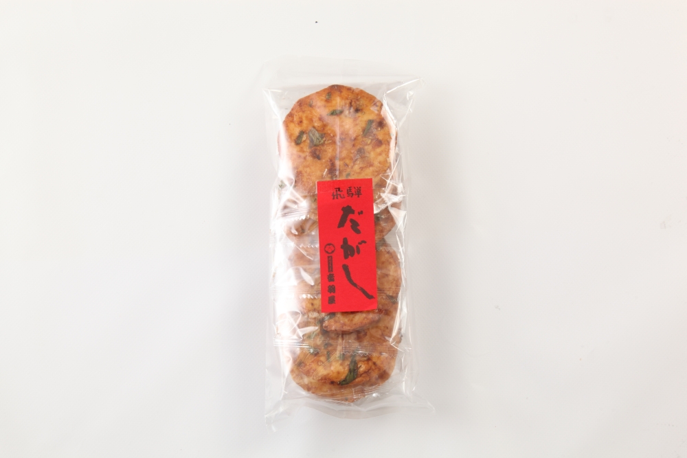 お米のせんべい生地に、ねぎ味噌を塗って香ばしく焼き上げました。飛騨地方で食されている「ほうば味噌」をイメージして作りました。