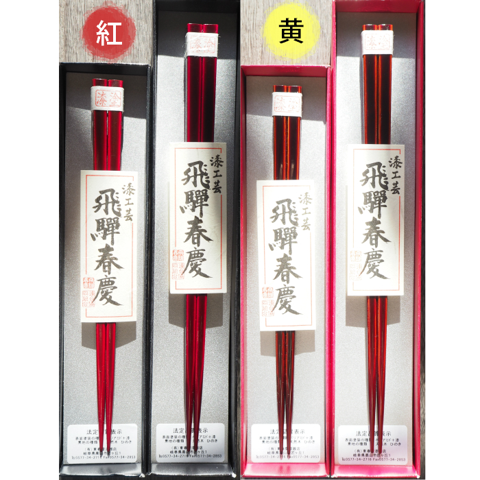「飛騨春慶」をもっと知って頂きたい。その美しさで食卓に華を添えたい。そんな思いから代々春慶塗の箸を作っております。 当店で昔から作られている四角い形の飛騨春慶箸です。多くの方の手に合うようにと試行錯誤を重ね、出来上がった形です。どうしてもこの箸がいいというお客様も見えるほどです。下地の色が【黄色】と【紅色】の箸があります。