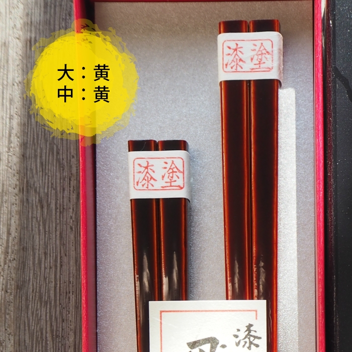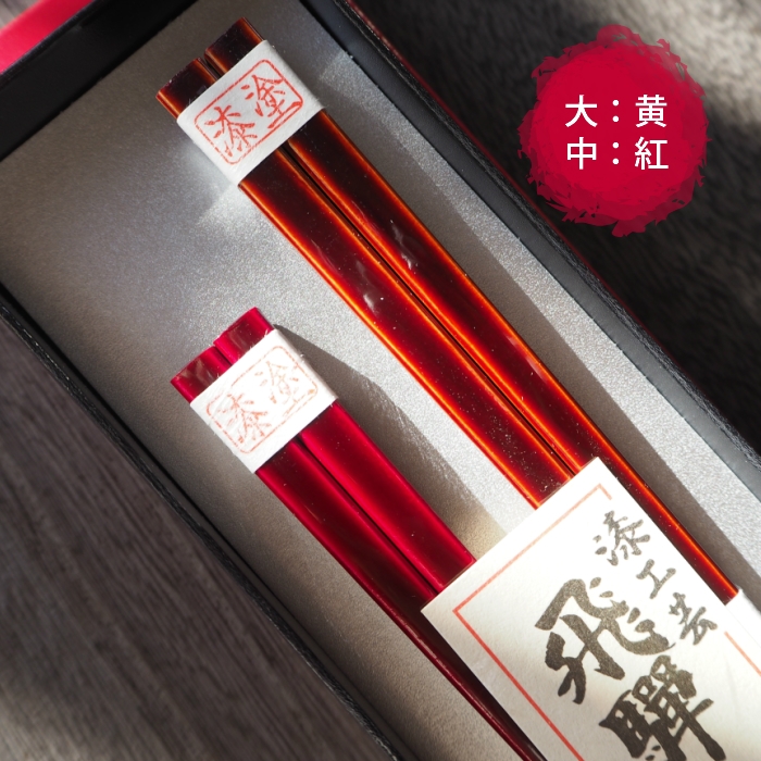 「飛騨春慶」をもっと知って頂きたい。その美しさで食卓に華を添えたい。そんな思いから代々春慶塗の箸を作っております。当店で昔から作られている飛騨春慶箸の夫婦です。多くの方の手に合うようにと試行錯誤を重ね、出来上がった形です。どうしてもこの箸がいいというお客様も見えるほどです。下地の色が、【大黄:中黄】【大黄:中紅】 の夫婦セットがあります。